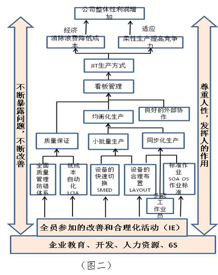 過去我們對TPS的系統認識,主要是從精益屋(圖一)里的所有工具知識開始,實施過程中我們也使用了很多的工具去解決現場問題,比如防呆防錯、快速換模等。但由于全員參與的氛圍不夠,而且每期項目結束后沒有形成長期的績效考核,導致經過一段時間后,部分改善后的指標又出現反彈。為了建立一套更符合我們匯美實業的TPS系統推行方法,使全員再好地參與到TPS當中來,形成一致的改善方法和習慣,從而形成具有匯美特色的精益生產文化,我們再次與豐田企業文化進行了對比,從《大野耐一語錄》中再次找到了另一個精益屋(圖二)。